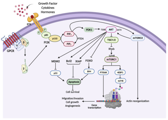 The protein kinase B (AKT)/mammalian target of rapamycin (mTOR) pathway is initiated by the activation of phosphoinositide 3-kinases (PI3K). PI3K, an enzyme consisting of a large family of lipid and serine/threonine kinases, is normally involved in lipid synthesis [29]. PI3K, a heterodimeric protein, is composed of p110 catalytic and p85 regulatory subunits [30]. It is a downstream effector that is activated in response to a variety of extracellular stimuli, such as hormones, cytokines and growth factors. The binding of growth factors to their cell surface receptors, including G protein-coupled receptor (GPCR) and growth factor/receptor tyrosine kinase (RTK), activates the receptor complex, which induces the dimerization and phosphorylation of PI3K (Figure 1) [31,32,33,34]. The p110 catalytic subunit of PI3K converts phosphatidylinositol 4,5-bisphosphate (PIP2) into phosphatidylinositol 3,4,5-trisphosphate (PIP3). Incidental proteins, known as PIP2 and PIP3, interact with PH domain proteins located on the inner layer of the plasma membrane, resulting in conformational changes in the protein molecules [35]. During activation, PIP3 induces the activation of phosphoinositide-dependent kinase-1 (PDK1) and downstream targets of AKT. Under normal conditions, phosphatase and tensin homolog (PTEN) functions as a tumor suppressor protein that suppresses the activation of AKT [36].