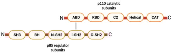The PI3K family is divided into four groups (classes I, II, III and IV) according to their structure, regulation and substrate specificity [109]. Class I PI3Ks are most widely reported to play a key role in the regulation of tumor progression and metastasis, providing important therapeutic targets [109]. Class I PI3Ks are further classified into two subclasses, namely, subclass IA (PI3Kα, β and δ) and subclass IB (PI3Kγ) [109]. Class IA enzymes are heterodimeric molecules containing p110 catalytic and p85 regulatory subunits (Figure 2). Five domains of p110 subunits are present in class IA enzymes, including an adaptor binding domain (ABD), a Ras-binding domain (RBD), a C2 domain, a helical domain and a catalytic kinase domain (CAT). The p85 subunit contains five domains: an N-terminal SH3 domain, a Rho-GAP domain, an nSH2 domain, an iSH2 domain and a cSH2 domain [110,111]. In the basal state, p110 and p85 subunits form a complex via the interaction of four domains (ABD-CAT domain, ABD-iSH2 domain, and helical-nSH2 domain), and part of the RBD domain of the p110 subunit is locked in the ATP binding site of the neighboring kinase domain, resulting in the inhibition of enzyme activity [112]. Class IB PI3Kγ also shares structural features; however, it does not contain an N-terminal p85-binding motif that controls its activity [110].