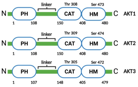 The AKT kinase family consists of three isoforms: AKT1, AKT2, and AKT3. All AKT isoforms are comprised of three conserved domains: an N-terminal pleckstrin homology (PH) domain, a central kinase catalytic (CAT) domain and a C-terminal extension (EXT) containing a regulatory hydrophobic motif (HM) (Figure 3). The PH and CAT domains of AKT are connected to the linker region (LINK), which shows no significant homology to other protein kinases [148]. AKT activity is regulated by phosphorylation and dephosphorylation in an Akt conformation-dependent manner. In the absence of stimulation, the PH and CAT domains of AKT are connected by intramolecular interactions to maintain AKT in an inactive state (PH-in conformation) in the cytoplasm [149]. AKT is activated in response to the binding of PIP3 to the PH domain of AKT, which leads to conformational changes in AKT (PH-out conformation) and translocation to the plasma membrane. The PH-out conformation exposes the CAT and regulatory domains, resulting in phosphorylation at two main residues: threonine residues in the activation loop of the CAT domain (Thr308 in AKT1, Thr309 in AKT2 and Thr305 in AKT3) and serine residues in the HM domain (Ser473 in AKT1, Ser474 in AKT2 and Ser472 in AKT2) [150,151]. Moreover, ATP occupies the ATP binding site located in the CAT domain to decelerate the dephosphorylation of AKT, leading to its full activation [152].