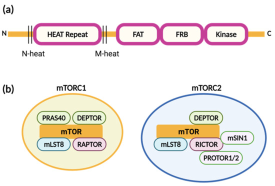 (a) Structures of mTOR1 and mTOR2 (created with BioRender.com). Each mTOR consists of HEAT repeats, FAT, FRB, and kinase domains. (b) mTOR complex 1 (mTORC1) is composed of mTOR, Raptor, mLST8, Deptor, and PRAS40, whereas mTORC2 includes mTOR, Rictor, mLST8, Deptor, mSin1, and Protor 1/2.