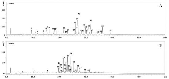 HPLC–PDA chromatograms of the polyphenolic compounds, extracted at 280 nm wavelength, of the hydroalcoholic extracts obtained from the aerial parts of M. fruticulosa subsp. fruticulosa (A) and subsp. coronopifolia (B). For peak identification, see Table 1.
