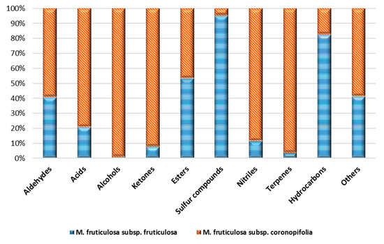 Figure 2 shows the normalized percentage composition, as classes of substances, of the two subspecies of M. fruticulosa, highlighting considerable differences between them.