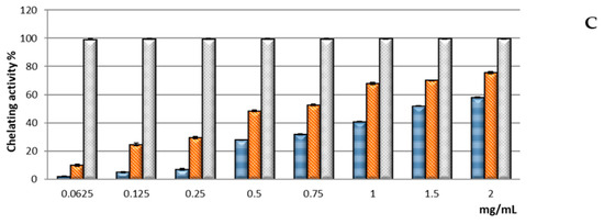 In the Fe2+ chelating activity assay, performed by evaluating the inhibiting effect on the Fe2+–ferrozine complex formation, both extracts of the two subspecies of M. fruticulosa showed good chelating properties, dose dependent, although lower than those of the reference standard EDTA (Figure 3C). Contrary to what has been observed in the other antioxidant assays, the extract of M. fruticulosa subsp. coronopifolia displayed the best chelating activity, reaching about 75% inhibition at the highest concentration tested. This was confirmed also by a comparison of the IC50 values calculated for the extracts, which indicated that the chelating efficacy of M. fruticulosa subsp. coronopifolia (0.63 ± 0.01 mg/mL) was approximately 2.5-fold higher than that of M. fruticulosa subsp. fruticulosa (1.49 ± 0.01 mg/mL). The chelating activity of the extract of M. fruticulosa subsp. coronopifolia was close to that previously found for that of M. incana subsp. incana (IC50 = 0.53 ± 0.02 mg/mL), the most effective among those from the infraspecific taxa of M. incana [2,18].