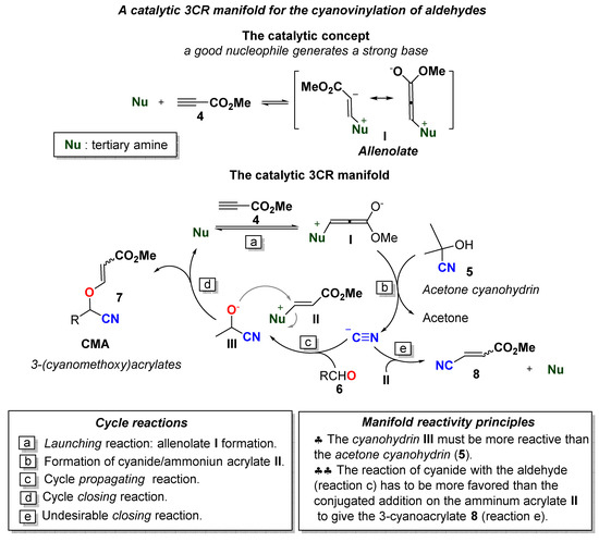 The 3CR process was designed to operate under organocatalytic conditions according to the catalytic concept of “a good nucleophile generates a strong base” [12,13,14,15] (Scheme 2). This catalytic concept allows for launching base-driven processes by the in situ generation of catalytic amounts of a strong base in the reaction medium. It is technically performed by the reaction of a Lewis base (nucleophilic catalyst) on a conjugated alkyne to generate a conjugated vinyl anion (strong base). In the design of this 3CR manifold, we chose a tertiary amine as the Lewis base catalyst, because they have proved to be excellent catalysts for the in situ generation of allenolate anions type I [12,16]. With this catalytic principle in mind, we designed the 3CR depicted in Scheme 2. The reaction manifold generates CMAs 7 through the catalytic cyanovinylation of an aldehyde substrate in the presence of stoichiometric amounts of cyanide anion and methyl propiolate (4). The choice of the cyanide anion source was an important design issue, because it had to be safe, environmentally friendly and suitable for the generation of cyanide anion under basic conditions, without introducing other reactive species into the catalytic cycle. Among of the commercially available cyanide precursors, we chose acetone cyanohydrin (5) because it meets all these criteria: it is safe [17] and it releases cyanide anion and acetone (waste) in the presence of bases [18]. The presence of acetone in the reaction medium should not introduce reactivity distortion issues in the catalytic process.