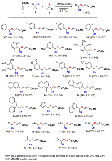 To a solution of aldehyde (6) (2.0 mmol), acetone cyanohydrin (5) (2.0 mmol) and methyl propiolate (4) (2.0 mmol) in n-hexanes (6 mL) was added N-methylmorpholine (0.05 mmol) at once and the reaction mixture was stirred for 1 h at room temperature. The solvent was removed under reduced pressure, and the residue was purified by flash column chromatography (silica gel; n-hexane/ethyl acetate: 80/20) to give the desired 3-(cyanomethoxy)acrylate 7.