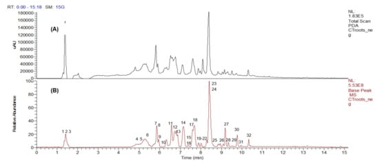The LC–DAD (A) and LC–MS (B) base peak chromatogram profiles of Clitorea ternatea crude root extract in negative ion mode.
