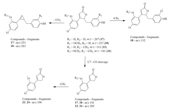 Proposed characteristic fragmentation pathway of compounds 17, 18, 23, and 24 (Clitorienolactones D, C, B, and A, respectively).