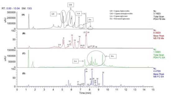 - Eklund, P.; Backman, M.; Kronberg, L.; Smeds, A.; Sjöholm, R. Identification of lignans by liquid chromatography-electrospray ionization ion-trap mass spectrometry. J. Mass Spectrom. 2007, 43, 97–107. [Google Scholar] [CrossRef]