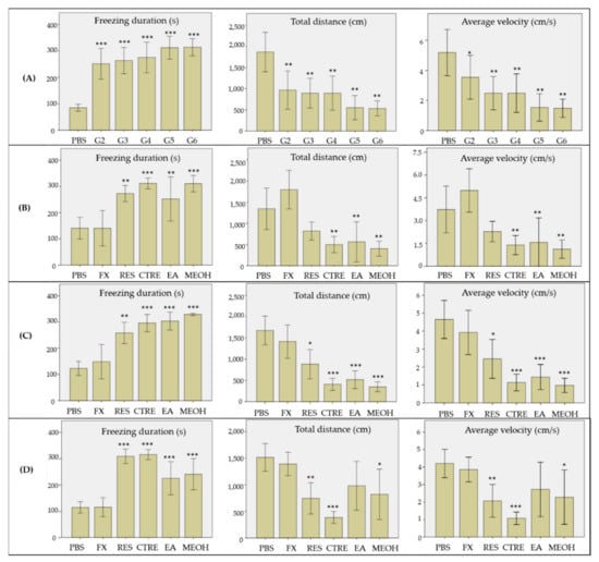 Data acquired from the novel tank test were analyzed using SPSS Statistics 17.0 software. Analysis of variance (ANOVA) was performed on the experimental data, and the means were compared using Duncan’s multiple range test.