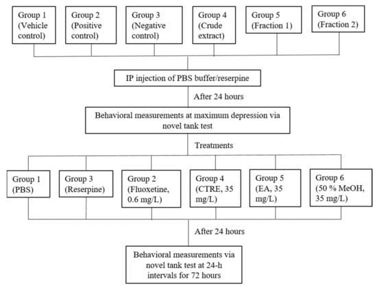 Induction of stress in zebrafish was carried out based on previously published research [48,64]. The fish were divided into 6 groups of 10 fish (5 males; 5 females). Group 1 was given PBS buffer at 5 uL/g bodyweight (BW), serving as the vehicle control. Intraperitoneal (IP) injections of reserpine (20 mg/kg BW) were administered to Groups 2–6 in order to induce stress-like responses. Before carrying out the induction, the acclimatized fish underwent fasting for 24 h. Prior to injection, the fish were anesthetized by immersion in a bath of iced water (12 °C), until operculum movement ceased or until only the gills were moving [65]. Treatments were then administered to the stress-induced fish via the immersion method, 24 h post-injection. Group 2 (positive control) was treated with 30 min immersion in 0.6 mg/L fluoxetine solution. Group 3 (negative control) received no treatment. Test sample treatment groups 4, 5, and 6 were treated with 6 h of immersion in 35 mg/L of the CTRE (Group 4), EA (Group 5), and 50% MeOH (Group 6) fractions, respectively. Fluoxetine and test sample solutions were prepared using Milli-Q water prior to immersion treatment. The fish groupings and workflow for the in vivo assay are illustrated in Figure 5. The experimental setup and procedures were approved by the Institutional Animal Care Use Committee (IACUC) of Universiti Putra Malaysia on 10 June 2015 (AUP-R013/2015).