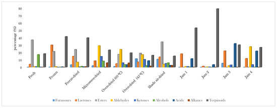 | No. | Compound Name and Class | RI Calc. | Fresh | Frozen | Freeze-Dried | Microwave-Dried | Oven-Dried (60 °C) | Oven-Dried (45 °C) | Shade Air-Dried | Jam 1 | Jam 2 | Jam 3 | Jam 4 |