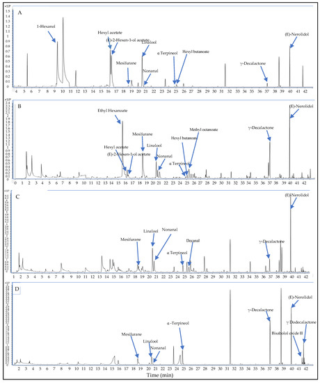 - Cannon, R.J.; Agyemang, D.; Curto, N.L.; Yusuf, A.; Chen, M.Z.; Janczuk, A.J. In-depth analysis of Ciflorette strawberries (Fragaria × ananassa ‘Ciflorette’) by multidimensional gas chromatography and gas chromatography-olfactometry. Flavour Fragr. J. 2015, 30, 302–319. [Google Scholar] [CrossRef]