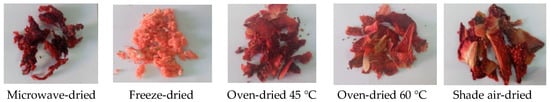 - Sadowska, A.; Świderski, F.; Hallmann, E. Bioactive, physicochemical and sensory properties as well as microstructure of organic strawberry powders obtained by various drying methods. Appl. Sci. 2020, 10, 4706. [Google Scholar] [CrossRef]