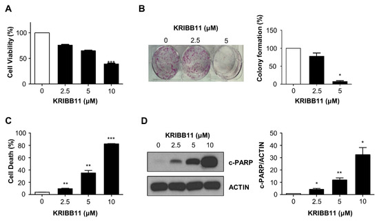 Effect of KRIBB11 on the survival of A172 cells. (A) A172 cells were treated with an increasing dose of KRIBB11 for 72 h, and the relative survival was determined using MTT assay. Data was presented as mean ± SE of triplicate experiments. (B) Colony forming assay was performed with 1000 cells/well of A172 cells treated with 0, 2.5, or 5 μM of KRIBB11. After 15 days, the colony number was counted with crystal violet staining (left). The mean value from three independent experiments were provided as percentage of control (right). (C) KRIBB11-induced cell death was represented as percentage of PI positive cells from total cells. Values are mean ± SE of three independent experiments. (D) Western blotting for cleaved PARP (c-PARP) was performed with lysates from A172 cells treated with various concentrations of KRIBB11 (left). Induction of apoptosis was evaluated by quantitation of c-PARP levels from three independent experiments with densitometric analysis after normalizing to β-Actin using Image J software. Data are mean ± SE of three independent experiments (right). * p < 0.05, ** p < 0.01, and *** p < 0.001 with respect to control values.