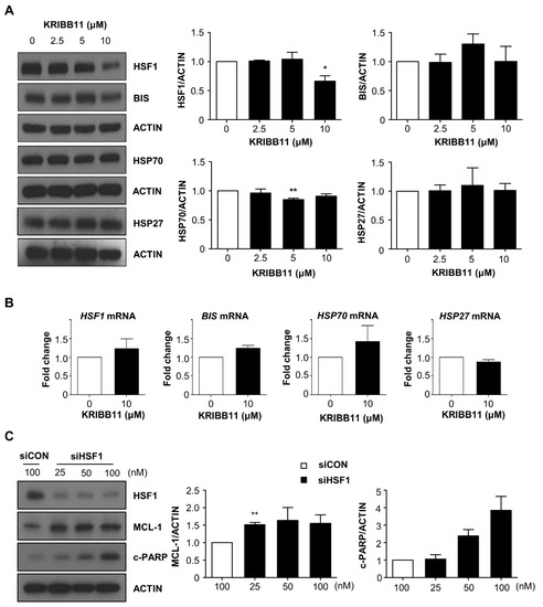 Effect of KRIBB11 on the expression of HSF1 and its target proteins. (A) Following treatment with KRIBB11 with the indicated dose, the expression of HSF1 and HSP70 was examined by Western blotting (left). Densitometry analysis for HSF1 and HSP70 from three independent experiments was shown in right column. (B) The mRNA levels of HSF1, BIS, HSP70, and HSP27 were determined by qRT–PCR analysis. (C) HSF1 expression was suppressed by siRNA (siHSF1) in A172 cells, and the expression of MCL-1 and c-PARP levels were determined by Western blotting analysis (left). The relative levels of MCL-1 and c-PARP were determined by densitometry analysis. The value from A172 cells transfected with control siRNA (siCON) was designated as 1.0. Data are mean ± SE of three independent experiments. * p < 0.05, and ** p < 0.01 vs. control values.