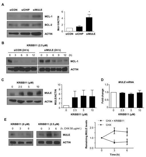 MCL-1 ubiquitin ligase MULE was stabilized by KRIBB11. (A) The effect of MULE depletion on MCL-1 was examined by transfection of specific siRNA (100 nM) for 48 h and subsequent Western blotting (upper). The relative levels of MCL-1 after depletion of CHIP or MULE were shown by densitometry analysis (lower). (B) MULE depletion retarded the KRIBB11-induced MCL-1 reduction, which was evaluated by Western blotting. (C,D). MULE levels after KRIBB11 treatment were determined by Western blotting (C) and qRT PCR analysis (D). (E) Cycloheximide (50 μg/mL) was treated with KRIBB11 (2.5 μM), and the kinetics of MULE expression was compared with cycloheximide only group by Western blotting (left). The quantitation of MULE was performed with densitometry (right). Data are mean ± SE of three independent experiments. * p < 0.05 vs. control values.