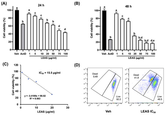Effect of LEAS on canine osteosarcoma D-17 cell line viability. Cells were treated with LEAS (1, 5, 10, 20, 50, 75, and 100 μg/mL) and cell viability was evaluated by MTT assays at 24 h (A) and 48 h (B). Cell viability is shown with respect to cells treated with vehicle (DMSO 0.1%). Actinomycin D (ActD) was used as a positive control (80 μg/mL). Data represent the mean of three independent experiments performed in triplicate. Different letters denote significant differences within the treatments (one-way ANOVA and Tukey’s pairwise comparison, p < 0.05). (C) Linear regression analysis of the concentration-response to calculate the half-maximal inhibitory concentration (IC50) of LEAS on the D-17 cell line at 48 h. (D) In vitro assessment of LEAS IC50 (15.5 μg/mL) by flow cytometry at 48 h using SYTOTM 9 green-fluorescent nucleic acid stain and propidium iodide. Representative plots of different treatments are shown.