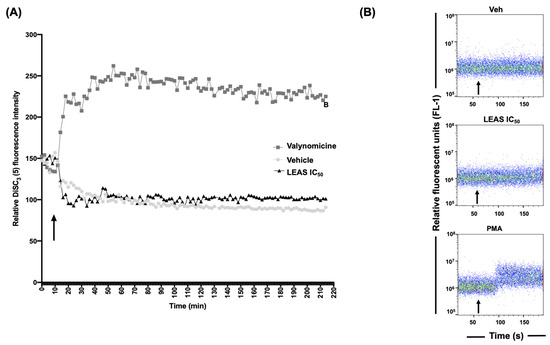 LEAS does not affect the cytoplasmic membrane integrity in D-17 cells. (A) Changes in the cytoplasmic membrane potential of D-17 cells were evaluated using membrane potential-sensitive dye. Cells were previously incubated with 200 μM of the dye DiSC3(5) for 30 min at 37 °C and then treated with LEAS IC50 (15.5 µg/mL). Valinomycin (0.2 mM) was used as a positive control. (B) The efflux of cytosolic calcium was analyzed by flow cytometry. Measurements were assayed by 3 min, and at minute one the cells were treated with LEAS IC50 (15.5 µg/mL), vehicle, or PMA 3 μM (acetate phorbol myristate) as a positive control. Representative plots are shown. Arrows indicate the time at which the treatments were added. Vehicle = DMSO (0.1%).