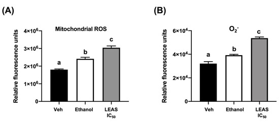 LEAS increased the production of ROS in D-17 cells. The production of mitochondrial ROS (A) and superoxide anion (B) were assessed by flow cytometry using the dyes DHE (5 μM) and DHR (10 μM), respectively. Cells were treated for 48 h with LEAS IC50 (15.5 μg/mL), vehicle (DMSO 0.1%), or ethanol (12%) as a positive control. The graphic shows fold-change values for each treatment. Each bar shows the mean of triplicates ± SE of two independent experiments. Different letters indicate statistically significant differences in relation to the vehicle (p < 0.05).
