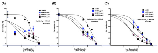 Synergistic effect of LEAS with cytostatic drugs on cell viability of D-17 cells. (A) Cisplatin, (B) Carboplatin, and (C) Doxorubicin. D-17 cells were subjected to the simultaneous treatment with LEAS (5, 10, 20, 50 µg/mL), cisplatin (3.34, 16.7, 33.4, 66.8 μM), carboplatin (50, 100, 200, 400 μM) or doxorubicin (46.8, 97.7, 187, 350 nM) and incubated for 72 h. The viable cells were determined by MTT assay and the IC50 was estimated. Controls consisting of cells treated with the individual compounds were included. All treatments were evaluated in two independent experiments performed by triplicate.
