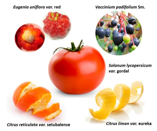 Fruits under study: Pitanga (Eugenia uniflora variety red) seeds and pulp, uva-da-serra (Vaccinium padifolium Sm.), tomato (Solanum lycopersicum variety gordal), lemon (Citrus limon variety eureka) peels and juice and tangerine (Citrus reticulata variety setubalense) peels and juice.