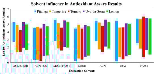 The influence of the extraction conditions on the antioxidants assays performance was assessed by measuring the TAC, TPC and TFC for each fruit extract (pitanga, tangerine, tomato, uva-da-serra and lemon) obtained using each of the seven solvent extraction conditions: methanol—MeOH, acetonitrile—ACN, ethyl acetate—EtAc, formic acid 0.1%—FA, ACN:MeOH (4:1, v/v), ACN:EtAc (1:1, v/v) and MeOH:FA (19:1, v/v). Log10 was applied to results obtained normalize the data obtained and allow a better comparison of the best extraction condition.