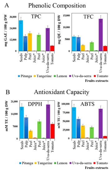 The TPC and TFC were determined to get a snapshot of the phenolic amount of the selected fruits. As shown in Figure 3A, pitanga seeds and uva-da-serra berries exhibit the highest phenolic content, while peels from lemon and tangerines and the pulp from pitanga also contain very interesting TPCs, being much lower for tomato and vestigial in tangerine and lemon juices. Although most of these individual results are in agreement with the previous literature results for uva-da-serra [], tangerine [] and lemon [] and tomato [], however, pitanga seeds present a TPC that is being, to the best of our knowledge, reported for the first time.