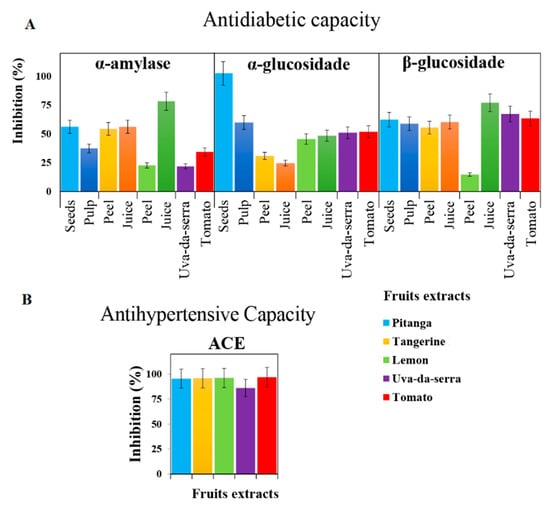 In vitro inhibitory activities (of the selected fruits samples towards (A) antidiabetic- (α-amylase—83 µL extract/1 U, α- and β-glucosidase—500 µL extract/1 U) and (B) antihypertensive- (ACE—8 µL extract/1 U)) model enzymes. For legend simplification, fruits sections were organized by colors: pitanga seeds and pulp in light and dark blue, respectively, tangerine peel and juice in yellow, and light orange, respectively, lemon peel and juice in light and dark green, respectively. Legend: ACE—Angiotensin-converting enzyme.
