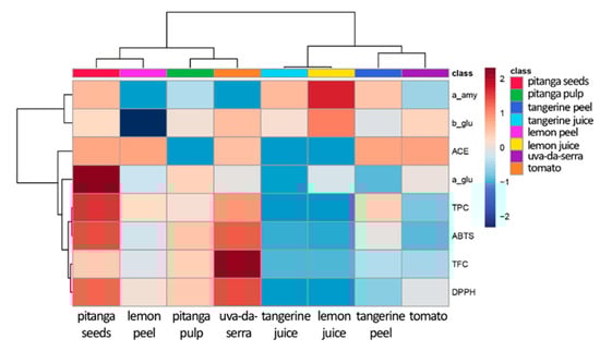In turn, there is a strong correlation between ABTS and TPC. Regarding the enzymatic inhibition assays, there is a strong correlation between themselves, which suggests that the nutraceuticals presented in the samples may have common anti-enzymatic effects. To further understand the translation of these correlations in the selected fruit extracts, correlations heatmaps were produced for each sample (Figure S1). The results obtained are evidence of important variations in the correlation between phenolic composition, antioxidant capacity and enzyme inhibition that were summarized in an overall correlation heatmap (Figure 5). Accordingly, it is easily observed that the contribution of the phenolics of each fruit extract to the antioxidant capacity is very different among fruits (uva-da-serra vs tomato, for instance), as well as among fruit sections (pitanga seeds vs pulp or tangerine and lemon peels vs. the respective juices). In relation to the enzyme inhibition assays, Figure 1 reveals a strong contribution of the phenolics present in pitanga seeds to the inhibition of the selected enzymes. Such behaviour is different from what can be observed for tangerine, lemon or uva-da-serra, in which the respective phenolics seems to be more effective against one enzyme than another. As an example of such correlation, such phenolic composition is not very effective in the inhibition of α-amylase or ACE despite the higher phenolic composition of the uva-da-serra extracts, which correlate with a high antioxidant capacity. In contrast, an overall positive correlation is particularly evident for pitanga seed extracts that present the highest phenolic content (Figure 3A), highest antioxidant capacity (Figure 3B) and highest enzyme inhibition (Figure 5). Similar correlation patterns were previously reported in citrus fruits by Alu’datt, et al. [].
