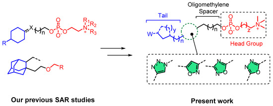 In the context of the present work, a series of 17 novel ether phospholipid derivatives was synthesized and structure–activity relationships were obtained. A systematic chemical investigation was performed considering the following modifications: (a) conformational restriction by incorporating 5-membered heteroaromatic rings in the lipid portion namely, 1,2,3-triazole, 1,2,4-oxadiazole, 1,3,4-oxadiazole and 3,5-disubstituted isoxazole, (b) variable length of the oligomethylene spacer between the heterocyclic ring and the phosphate head group, (c) replacement of choline by homocholine in the phosphate polar head-group and (d) attachment of alkyl, cycloalkyl, alkylcarbamate and carboxyalkyl groups as substituents of the heterocyclic ring (Figure 1).