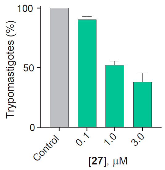 In order to determine if compounds 25, 27 and 29 were able to lyse T. cruzi trypomastigotes, this developmental stage was treated for 24 h with various compound concentrations. Significant lysis of the parasites was observed only with the 27 treatment (LD50 = 1.02 μΜ, Figure 6), highlighting its broad spectrum antiparasitic profile.