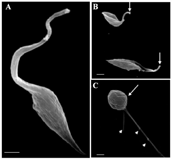 Scanning electron micrographs of T. cruzi epimastigotes treated with compound 27. (A) Control after 72 h of growth. Integrity of untreated cells: elongated cell body and single tapering flagellum; (B) shortening of the flagellum when compared to the control (arrow); (C) multiple flagella (arrowheads) and misshapen cell body (arrow). Bars = 1 µM.