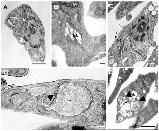 Transmission electron micrographs of T. cruzi epimastigotes treated with compound 27 (concentration = IC50 calculated in epimastigotes) for 48 h. (A) The untreated control shows the preserved organelles. (B–E) Epimastigotes treated with 27 and disorganization of the Golgi complex (B and C, GC), formation of autophagosome-like cytoplasmic vacuoles (D and E, asterisks) surrounded by a membrane similar to the endoplasmic reticulum (arrowheads) and detachment of the membrane plasma (B—arrow). N = nucleus; K = kinetoplast; GC = Golgi complex; F = flagellum. Bars = 0.5 µm.