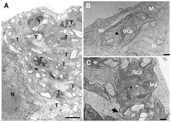 Transmission electron micrographs of T. cruzi intracellular amastigotes after 72 h of treatment with 27 (IC50 concentration). (A) The untreated control showing a host cell with intracellular trypomastigotes (T). Host cell and parasites do not show any changes. (B,C) Interactions between LLCM-K2 and T. cruzi treated with 27 show alterations in the Golgi complex (B–GC) and the formation of structures similar to autophagosomes (C-arrow). N = nucleus, T = trypomastigotes, GC = Golgi complex, M = mitochondria. Bar = 1 µm.