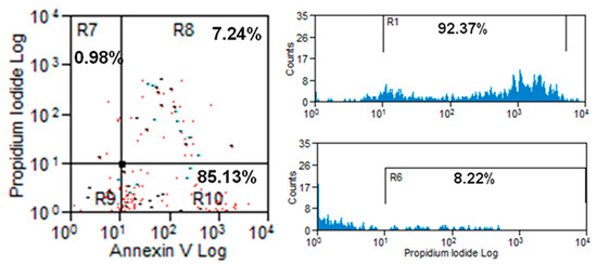 Flow cytometry of T. cruzi epimastigotes treated with 5 µM of compound 27 for 24 h labelled with annexin V-Alexa 488 nm and propidium iodide. Approximately 85% of epimastigotes are marked with annexin V, indicating an onset of the apoptotic process. Of these, more than 90% are also marked with propidium iodide, indicating a loss of integrity of the plasma membrane.