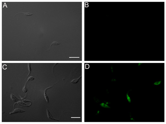Immunofluorescence microscopy of T. cruzi epimastigotes labelled with the Click-iT TUNEL assay. (A,B) correspond to untreated cells and (C,D) represent cells treated with compound 27 at 5 µM for 24 h. Note that 60% of treated cells are marked (D-green) indicating that the main type of death used by epimastigotes after treatment is the apoptotic process. Bars = 15 µm.