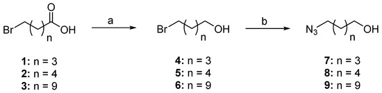 Synthesis of azides 7–9. Reagents and conditions: (a) BH3∙Me2S, THF, rt, 1 h; (b) NaN3, DMF, 40 °C, 2 days.