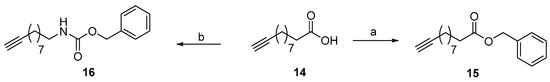 The required alkynes were either commercially available (compounds 10–13) or prepared as described in Scheme 2. Alkyne 15 was obtained by esterification of 10-undecynoic acid (14) with benzyl bromide in DMF using Cs2CO3 as a base in 93% yield. Alkyne 16 was synthesized through a Curtius rearrangement reaction from 10-undecynoic acid (14) using diphenylphosphoryl azide followed by the addition of benzyl alcohol in 66% yield [38].