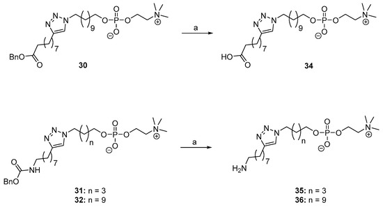 Synthesis of ether phospholipids 34–36 via catalytic hydrogenolysis. Reagents and conditions: (a) H2, 10% Pd/C, MeOH, rt, 12 h.
