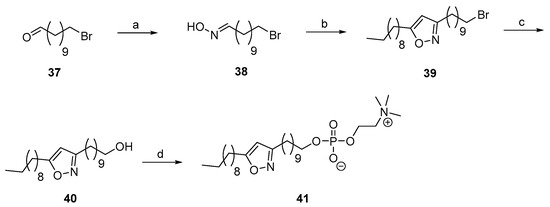 Synthesis of ether phospholipid 41. Reagents and conditions: (a) NH2OH∙HCl, 1 M aq. NaOH and tBuOH, rt, 1.25 h; (b) 1-dodecyne, Et3N, NaOCl and CH2Cl2, rt, 24 h; (c) K2CO3 and H2O/DMSO (2:1), 100 °C, 24 h; (d) (1) POCl3, Et3N and THF, −5 °C, 15 min then H2O, 30 min; (2) pyridine, 45 °C, 2.5 h; (3) pyridine, choline tosylate and MSNT, 0 °C then rt, 48 h.