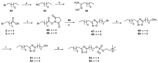 The preparation of phospholipids 53 and 54 bearing a 1,2,4-oxadiazole ring is described in Scheme 6. Nonanitrile (43) was obtained upon treatment of 1-bromooctane (42) with NaCN in DMF and was subsequently reacted with NH2-OH∙HCl in the presence of NaHCO3 to obtain amidoxime 44 in 59% yield. The required active esters 45 and 46 were synthesized from the commercially available ω-bromo acids 2 and 3, respectively, after reaction with NHS and DCC in THF. Subsequently, the formation of the 1,2,4-oxadiazole-containing bromides 47 and 48 was accomplished in 52% and 64% yield, respectively, through the reaction of 44 with 45 or 46 under microwave irradiation. Thereafter, reaction of bromides 47 and 48 with CH3CO2K and hydrolysis of the obtained acetates 49 and 50 with LiOH afforded the required alcohols 51 and 52, which were phosphorylated following the procedure described above to obtain phospholipids 53 and 54, respectively (Scheme 6).