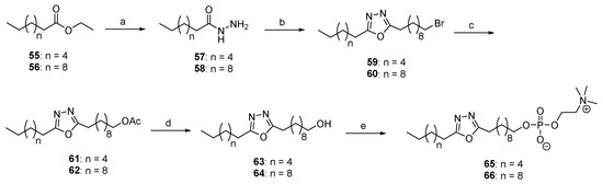 The synthesis of phospholipids 65 and 66 bearing a 1,3,4-oxadiazole ring is reported in Scheme 7. Commercially available ethyl octanoate (55) or ethyl dodecanoate (56) were converted to the corresponding hydrazides 57 and 58 under microwave irradiation using NH2NH2∙H2O in 33% and 54% yield, respectively, and were subsequently coupled with 11-bromoundecanoic acid (3) in the presence of POCl3 to furnish the 1,3,4-oxadiazole-substituted bromides 59 and 60 in 60% and 77% yield, respectively. These in turn were converted to the corresponding alcohols 63 and 64 following an analogous procedure as described above for alcohol 51. Eventually, phospholipids 65 and 66 were obtained from the phosphorylation of alcohols 63 and 64 and reaction with choline tosylate in the presence of MSNT (Scheme 7).