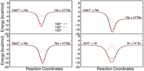 In cases of Ne + HeH and Ar + ArH reactive systems, the existence of other interesting stable species is also observed in Figure 2. Shallow potentials can be seen in Ne+HeH and Ar+ArH color maps when the free Rg atom approaches the diatomic molecular ion from the other Rg atom side. This suggests formation of weak Rg⋯RgH complexes. The bond distance of one RgH is very close to the free RgH. For [HeHNe], the second minimum (Ne⋯HeH) is 1.36 kcal/mol lower than the Ne+HeH asymptote, whereas for ArH, the other minimum (Ar⋯ArH) is 2.74 kcal/mol lower in energy compared to the Ar+ArH asymptote. Although existence of a second minimum was reported for NeH in Reference [40], no such minimum was found for NeH in [70].