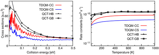 with , being the energy of the initial rovibrational state of the reactant diatom and g the electronic degeneracy. Finally, the ICS of Equation (13) evaluated in the collision energy , is employed for the calculation of the rate constants as
