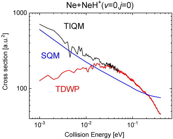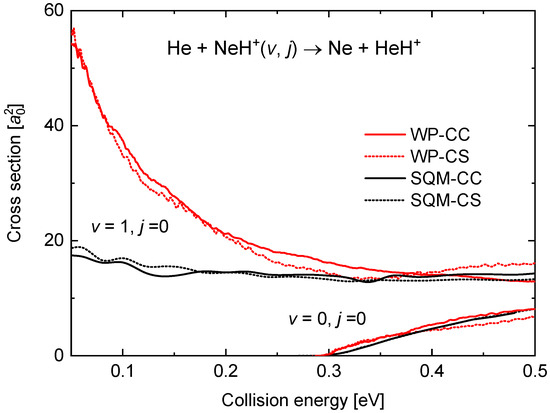 - Gamallo, P.; Martínez, R.; Sierra, J.D.; González, M. Understanding the effect of vibrational excitation in reaction dynamics: The Ne + H2+ (v = 0–17, j=1) → NeH+ + H, Ne + H+ + H proton transfer and dissociation cross sections. Phys. Chem. Chem. Phys. 2014, 16, 6641–6648. [Google Scholar] [CrossRef] [PubMed]
