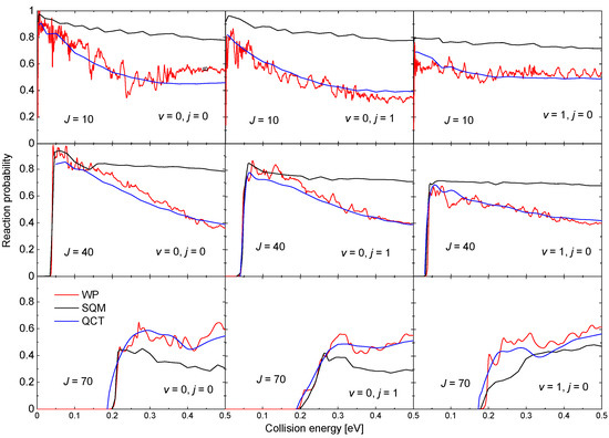 Reaction probabilities as a function of the collision energy (in eV) for the Ne + HeH He + NeH reaction for (left panels), (middle panels) and (right panels) for different values of the total angular momentum: (top panels); (second row panels) and (bottom panel). Comparison of WP (red lines), SQM (black lines), and QCT (blue lines) results adapted from the work in [63].