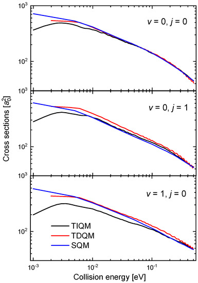 The oscillatory behaviour of the time-dependent QM (TDQM) probabilities of Figure 9 disappears when we obtain the ICSs, washed out as a result of the partial waves averaging effect. The corresponding cross section for the case between 10 eV and 0.5 eV is shown in Figure 10. The comparison with the QCT and SQM results, also shown in the figure, reveals significant discrepancies with these two approaches at the lower energies [63]. The trend followed by the TDQM ICSs as the energy decreases is a consequence of the difficulties of the WP techniques at this regime, but as shown in [64], it can be solved by means of a TIQM calculation. Computationally much cheaper, it is possible to show by means of the SQM approach that the proper trend exhibited by the ICSs at such low-energy regime is directly related with a correct description of the asymptotic region employing sufficiently large distances in the calculation [63,88,100,101]. The ICS obtained with the TIQM method is in a nice agreement with both the QCT and SQM predictions.