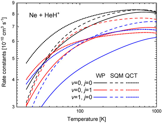 The rate constants between K and 1000 K obtained from the ICSs shown in Figure 9 are presented in Figure 11 for the three initial rovibrational states of the reactant HeH under consideration. The comparison of the WP values reveals that the ground state yields the larger , followed by the one for the first rotationally excited state . The lowest rate constant in the comparison shown in Figure 11 is obtained for the first vibrationally excited states . In particular, at K, cm s, whereas cm s and cm s. The same sequence is observed among the corresponding SQM rates, but, the QCT calculation, on the contrary predicts certain crossing between the and rates around K.