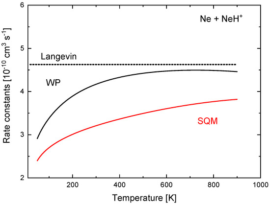 Rate constants (in cm s) as a function of the temperature (in K) for the Ne + HeH He + NeH reaction for (black), (red) and (blue) obtained with the WP (solid lines), SQM (dashed lines) and QCT (dotted lines) calculations of Reference [63]. Logarithmic scales have been used in both axes.