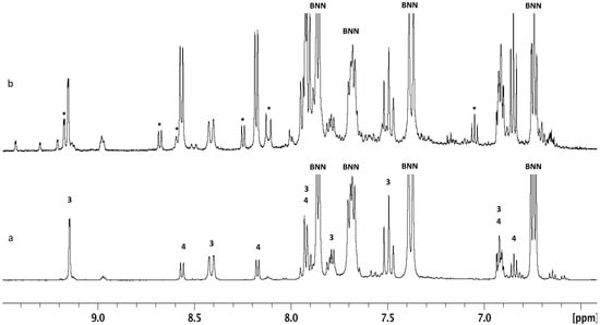1 HNMR analysis of the nitration mixture from the reaction of BNN with AcONO2 and NO2BF4 in CH3CN at 10–20 °C. The products were measured in CD2Cl2. (a) AcONO2 prepared from 1.0 equiv. of AgNO3 and 1.1 equiv. of AcCl. (b) NO2BF4, 1.0 equivalent (dinitro-BNN (6) labeled as *).
